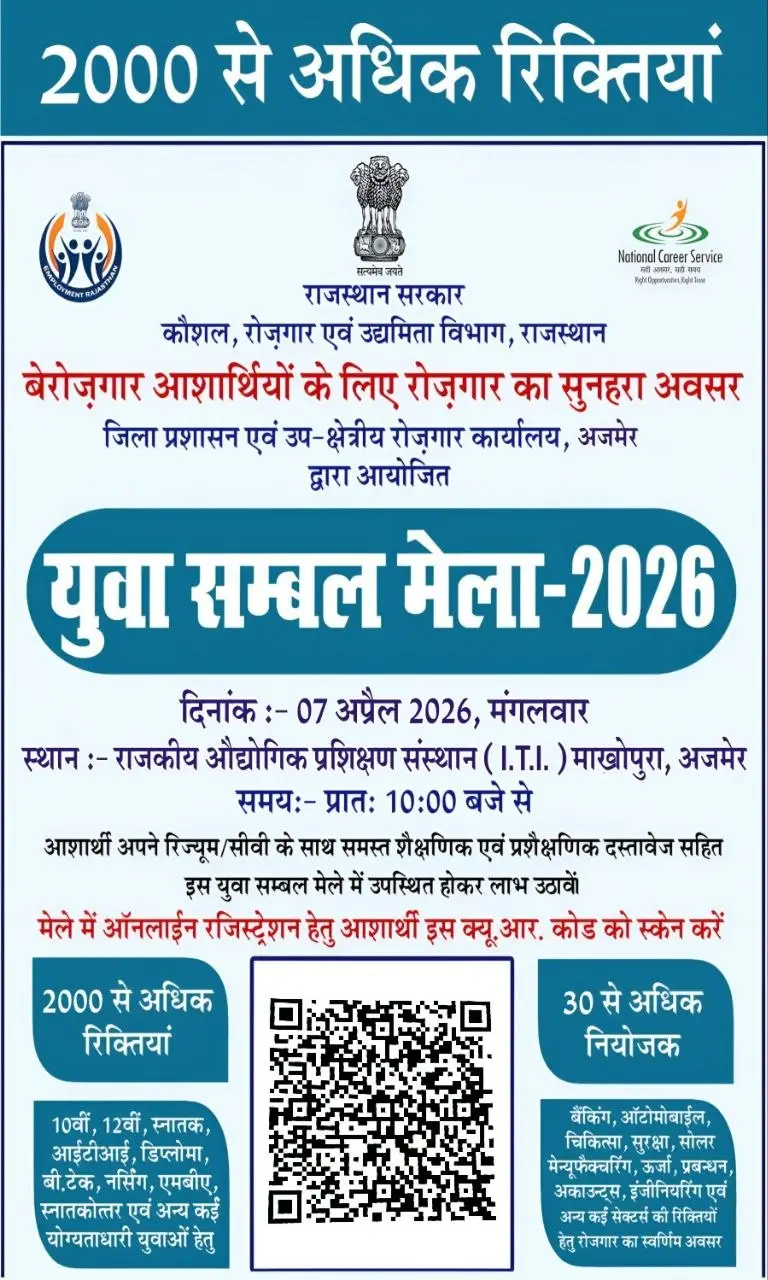 Yuva Sambal Mela 2026 : राजस्थान सरकार के कौशल, रोजगार एवं उद्यमिता विभाग द्वारा बेरोजगार युवाओं के लिए एक शानदार अवसर प्रदान किया जा रहा है। जिला प्रशासन एवं उप-क्षेत्रीय रोजगार कार्यालय, अजमेर के माध्यम से युवा संबल मेला-2026 का आयोजन किया जा रहा है, जिसमें हजारों युवाओं को रोजगार पाने का मौका मिलेगा। इस मेले का मुख्य उद्देश्य प्रदेश के शिक्षित एवं प्रशिक्षित युवाओं को विभिन्न निजी और सरकारी क्षेत्रों में रोजगार उपलब्ध कराना है। इससे शिक्षित बेरोजगारी को कम किया जा सकेगा। और योग्य युवाओं को रोजगार का अवसर मिलेगा। जिससे वे अपनी जीवन शैली में सुधार के अवसर ढूंढ पाएंगे। इसमें युवाओं के लिए 2000 के लगभग में पद रखे गए हैं। इस रोजगार मेले में अलग अलग सेक्टर की कम्पनियां एक ही स्थान पर होंगी। इसमें युवाओं का चयन सीधे इंटरव्यू के आधार पर किया जायेगा।